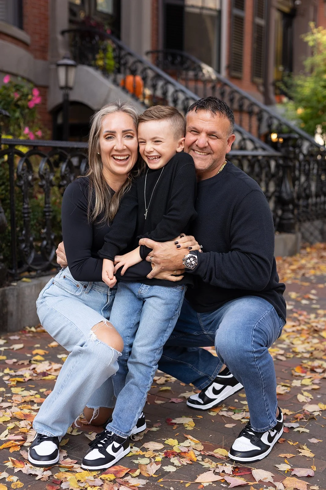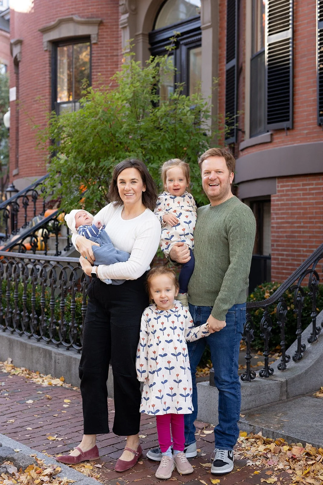 After getting all warmed up, we headed out to their deck to take advantage of the stunning city views and lingering November sunshine. The view in the background made for the perfect backdrop, adding a personal touch of their neighborhood to their family photos. To wrap things up, we took to the sidewalks and strolled down their pretty Back Bay street, capturing some natural, joy-filled candids as they walked together as a family.
